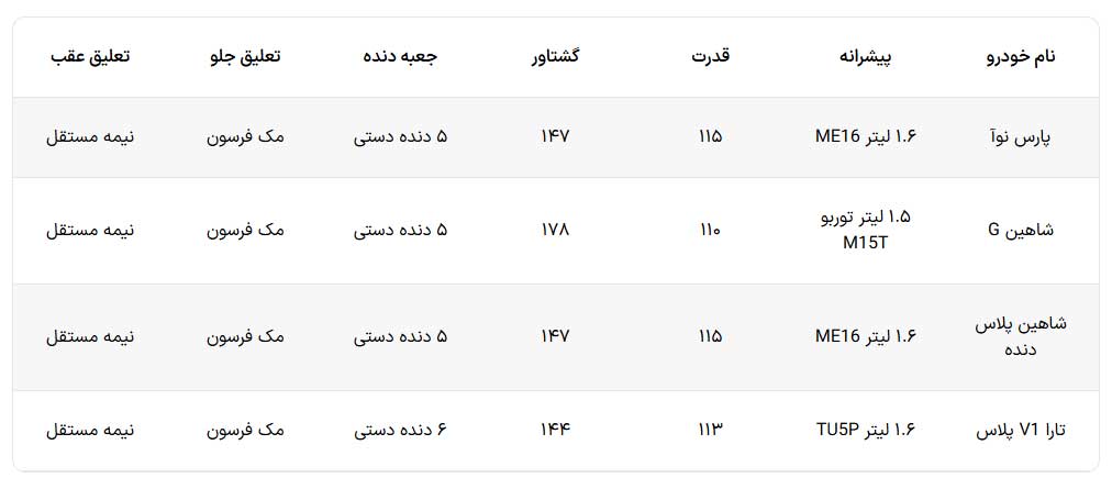 همانطور که در جدول می بینید، پارس نوآ مشخصات یکسانی با تارا V1 پلاس و شاهین پلاس دنده ای دارد. در مقابل شاهین دنده ای هم اگرچه گشتاور شاهین G بالاتر است اما پیشرانه به روز تری را در پارس نوآ می بینیم. سیستم تعلیق هم در تمام این خودروها تقریبا یکسان است و البته سواری بسته به نوع مدل خودرو می تواند متفاوت باشد. پس عملا از نظر فنی پارس نوآ با این سه خودرو رقابت خواهد کرد و البته چیزی هم از آن ها کم ندارد.